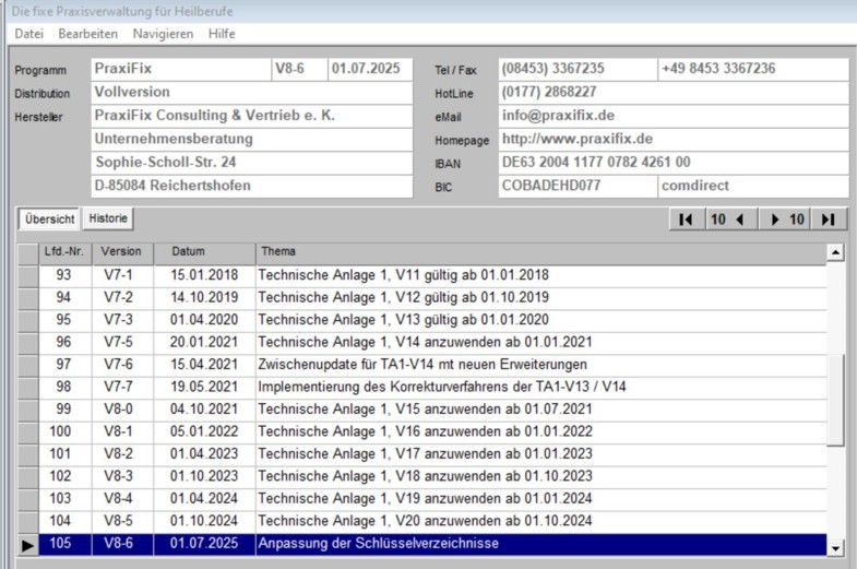 Wir haben beginnend mit dem Jahr 1999 bis 2025 bereits 105 Updates erstellt, verteilt und erfolgreich installiert. Unsere Kunden hatten allen Grund, mit unserer Leistung zufrieden zu sein. PraxiFix läuft auf allen Windows-Versionen stabil. Die mitgelieferte dBASE-Datenbank kann Millionen von Datensätzen abspeichern ohne dabei an Leistungsfähigkeit zu verlieren. Wir sagen immer: "Die dBASE-Datenbank geht auch bei einer Milliarde Datensätzen nicht in die Knie." Bisher haben wir Recht behalten.