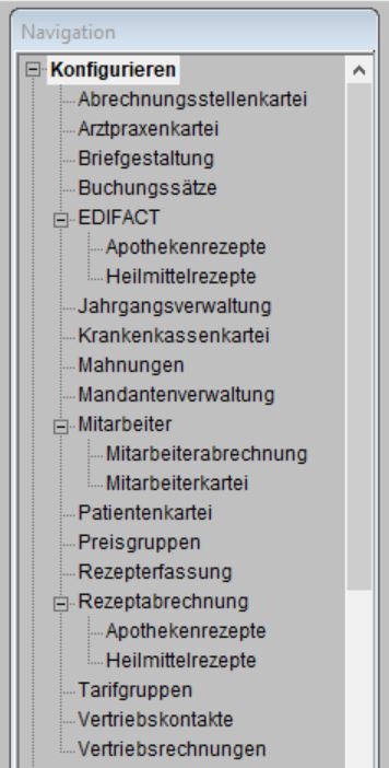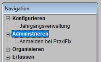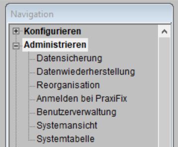 Der zweite Menüpunkt im Navigationsfenster heißt [Administrieren]. Darunter versteht man bei PraxiFix die Fähigkeit, bis in die tiefsten Tiefen des Programms vorzustoßen, um systemische Einstellungen und Verhaltensweisen von PraxiFix zu verabreden.