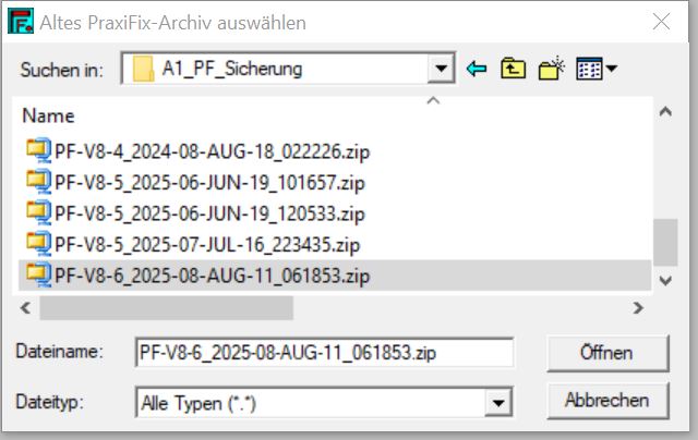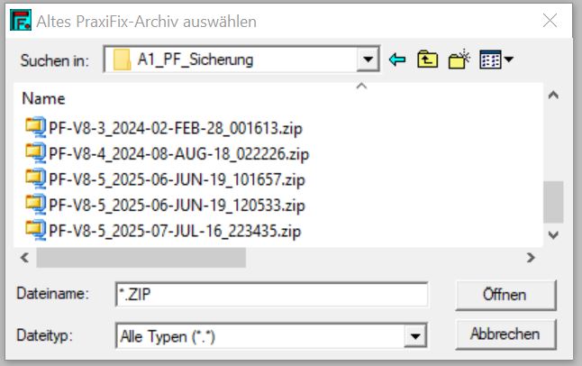 PraxiFix kennt natürlich den Ablageort aller ZIP-Dateien. Dieser Archivordner wird hier angezeigt, um eine Datei als Datensicherung auszuwählen. In unserem Fall heißt der Speicherort A1_PF_Sicherung. Der Dateiname jedes ZIP-Archivs enthält die Version der Datenbank zum Zeitpunkt der Datensicherung. Im obigen Bild sind Archive mit den Versionen V8-3, V8-4 und V8-5 zu sehen. Wenn die aktuelle Version der Datenbank jedoch V8-6 sein sollte, dürfen Sie kein ZIP-Archiv einer veralteten Datenbank-Version auswählen. PraxiFix würde diese Inkonsistenz sofort bemerken und die Aktion abbrechen.