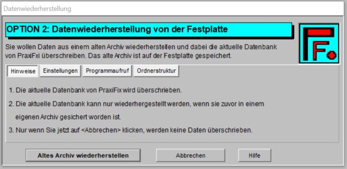 Hinweis: Dateinamen für ZIP-Archive sind so aufgebaut, dass sich die ZIP-Dateien im Zielordner nicht überschreiben können. Es gibt Datensicherungsprogramme, die immer wieder denselben Archivnamen verwenden und Daten überschreiben. Genau das tut PraxiFix nicht. Die ZIP-Archive sind klein und leicht zu handhaben. Es ist sinnvoll, alle Archive in chronologischer Reihenfolge aufzuheben.