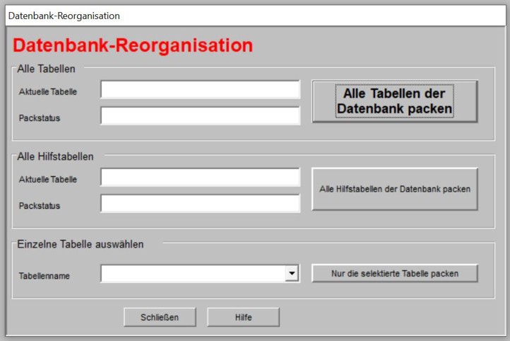 Bei der Reorganisation hat der Administrator die Möglichkeit, eine Überprüfung der Datenbank und ihrer Datenintegrität vorzunehmen, ohne anschließend eine Datensicherung durchzuführen zu müssen. In dem Formular klickt der Administrator auf die Schaltfläche [Alle Tabellen der Datenbank packen]. Dann rattert das Programm durch die gesamte Datenbank und indexiert jede Tabelle komplett durch. Das Ergebnis des Packens wird anschließend angezeigt. Wenn alle Tabellen gepackt werden konnten, können Sie beruhigt weiterarbeiten.