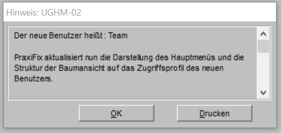 PraxiFix gibt einen Hinweis darauf, dass nun für den neuen Benutzer "Team" dessen hinterlegtes Zugriffsprofil aktiviert und auf die bestehende Menüstruktur aufgeprägt wird. Menüpunkte, die der Administrator zuvor sehen konnte, sind plötzlich verschwunden, weil sie für den Benutzer "Team" nicht zugänglich sein sollen.
