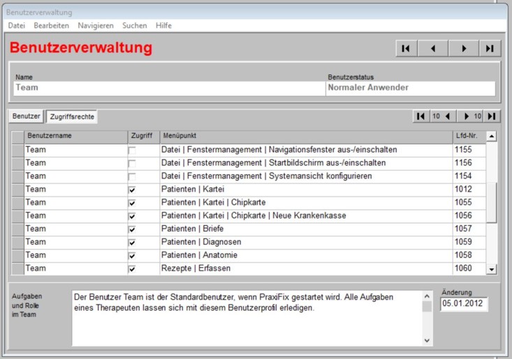 In der Benutzerverwaltung werden Personen oder Gruppen von Personen angelegt, die Zugriff auf PraxiFix erhalten sollen. Der Administrator legt fest, welche Person Zugriff auf welche Programmpunkte erhalten muss, um ihre Aufgaben zu erledigen. Das nächste Formular zeigt die Registerkarte [Zugriffsrechte] in der Benutzerverwaltung. Zuvor hat der Administrator den Gruppenbenutzer "Team" angelegt. Der Computer wird am Morgen eingeschaltet. PraxiFix startet mit dem Benutzer namens "Team".