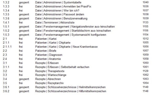 Aber überall dort, wo in der zweiten Spalte das Wort "gesperrt" zu finden ist, verwehrt PraxiFix den Zugang zu diesem Menüpunkt.