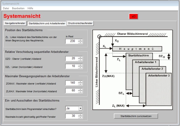 Die Werte XL und X0 definieren die linke obere Ecke des Hauptmenüs. Der Parameter ZL beschreibt die linke Einrückung des Startbildschirms relativ zum Hauptmenü. In der Regel befindet sich links vom Startbildschirm das Navigationsmenü, so dass ZL im Wesentlichen die Breite des Navigationsmenüs plus einen Zuschlag als schmalem Abstand zwischen den beiden Fenstern beschreibt.