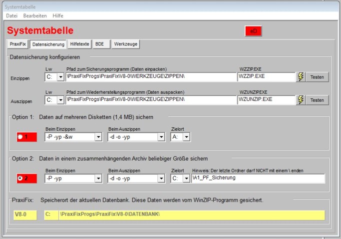 In der Systemtabelle werden grundlegende Werte eingestellt, die PraxiFix zum korrekten Betrieb benötigt. Zu diesen Einstellungen gehören die Zugriffe auf externe Programme. Das wichtigste Programm ist der WinZIP zum Zwecke der Datensicherung und einer möglicherweise notwendigen Datenwiederherstellung. Auf der Registerkarte [Datensicherung] werden die Zugriffspfade auf das Einpacker-Programm (WZZIP.EXE) und auf das Auspacker-Programm (WZUNZIP.EXE) festgelegt. Beide Programme werden zusammen mit PraxiFix ausgeliefert, so dass dem Käufer keine weiteren Kosten entstehen. Früher wurde auf Disketten mit begrenztem Speicherplatz oder auf kleinen Memory-Sticks gesichert. Das ist die Bedeutung der Option 1. Heute ist unbegrenzt Speicherplatz verfügbar, so dass die Option 2 zum Tragen kommt.
