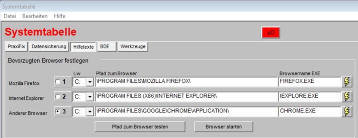 Auf der Registerkarte [Hilfetexte] muss der Administrator festlegen, mit welchem Werkzeug die integrierten Hilfetexte von PraxiFix angezeigt werden sollen. Alle Hilfetexte existieren im HTML-Format. Sie bilden eine Wikipedia mit einem Inhaltsverzeichnis von über Hundert Textseiten. Um sie lokal auf dem Computer anzuzeigen, benötigen man einen Browser. Die drei häufigsten Browser werden in der folgenden Abbildung gezeigt. Es sind der Mozilla Firefox, der Internet Explorer von Microsoft und der Chrome-Browser von Google.