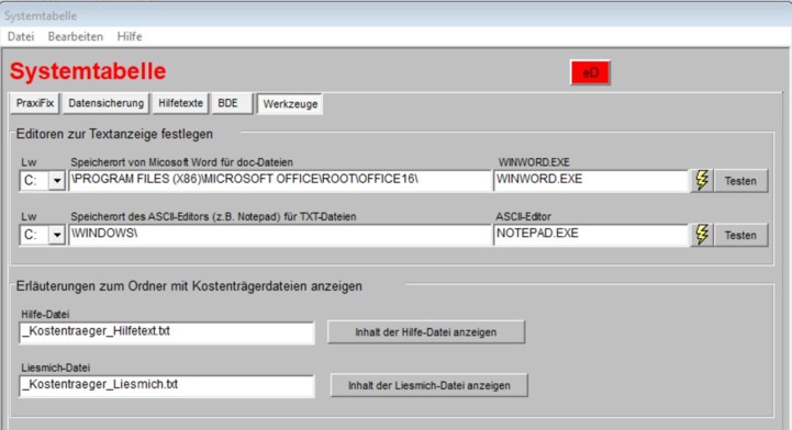Auf der Registerkarte [Werkzeuge] werden weitere Ressourcen eingestellt, die PraxiFix benötigt. Bei der Herstellung von Serienbriefen nutzen wir Word von Microsoft, um aus den Adressdatensätzen und dem verknüpften Serientext die personalisierten Serienbriefe zu erzeugen. Wir stellen somit den Pfad zu WINWORD.EXE ein, um das Programm jederzeit starten zu können.