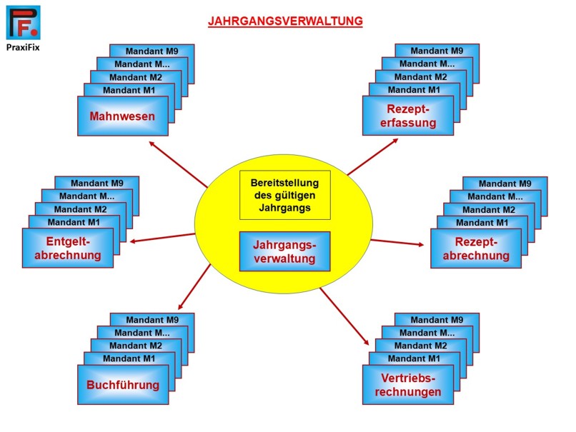 Die Jahrgangsverwaltung gehört zu den Steuerungsmodulen in PraxiFix. Dieses Modul legt fest, wie andere Module reagieren müssen, wenn ein neuer Datensatz erzeugt wird. Jeder Datensatz benötigt eine eindeutige Nummer, so dass man ihn finden und mit anderen Datensätzen in anderen Tabellen der Datenbank verknüpfen kann. Mehrere wichtige Module in PraxiFix benötigen für ihren Schlüssel sowohl eine mandantenspezifische Zuordnung als auch eine eindeutige Abhängigkeit zu einem Jahrgang.