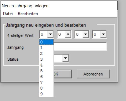 Der Jahrgang setzt sich aus vier Ziffern zusammen. Jede Ziffer wird aus einem Listenfeld mit den Ziffern 0 bis 9 ausgewählt. Wenn Sie alle vier Ziffern ausgewählt haben, wird das darunter liegende Feld Jahrgang komplett angezeigt.