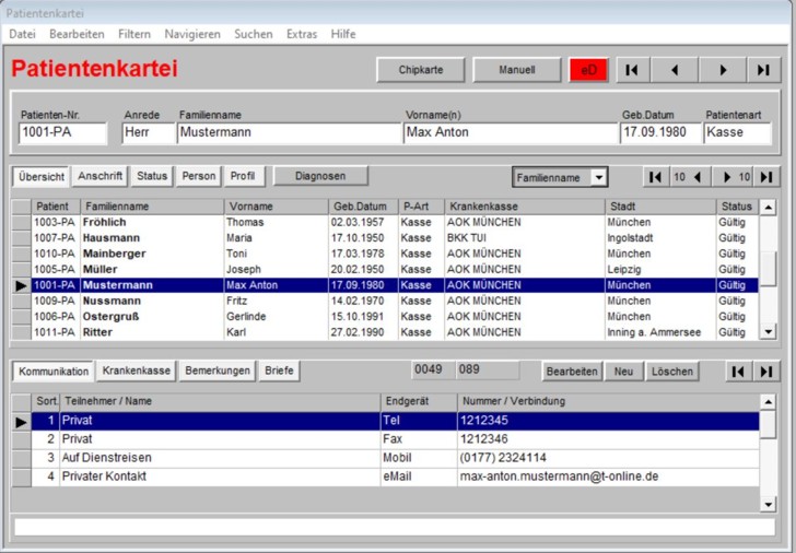 Die Patientenkartei hat die Aufgabe, alle notwendigen Daten über Patienten zu sammeln und zu strukturieren, so dass diese Daten für unterschiedlichste Zwecke zur Verfügung stehen. Auf der Basis dieser Daten können in einem nachgelagerten Schritt neue Rezepte erfasst, Termine vergeben und Behandlungsleistungen erbracht werden. Die Patientenkartei sammelt die Diagnosen aller Patienten in einer verknüpften Diagnosekartei, so dass Sie mit einem Blick die gesamte Krankengeschichte eines Patienten einsehen können.