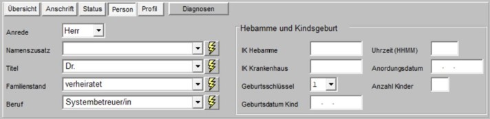 Hinweis zu Hebammen: Wenn eine freiberufliche Hebamme mit unserem Praxisprogramm arbeitet, legt sie für jedes Baby, das sie zur Welt gebracht hat, einen Patienten in der Patientenkartei an. Jede Hebamme wird durch ihr Institutionskennzeichen, also ihre IK-Nummer, identifiziert. Diese IK-Nummer trägt sie in der Patientenkartei auf der Registerkarte [Person] ein. Wenn das Baby in einem Krankenhaus zur Welt kam, trägt sie zusätzlich noch die IK-Nummer des Krankenhauses oder der Geburtsklinik ein.