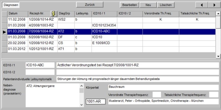 [Abb. 1406-06]: Patientenkartei mit einem Diagnoseblatt und allen Diagnosedaten