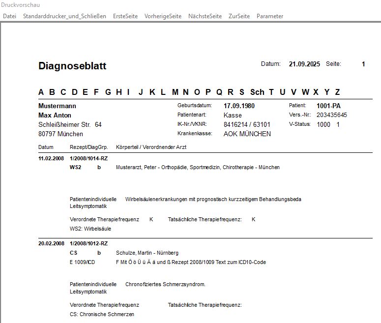 Das Diagnoseblatt hatten wir bereits weiter oben ausführlich besprochen. Es reproduziert die Krankengeschichte des ausgewählten Patienten.