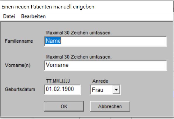 Bei der manuellen Erfassung eines neuen Patienten werden genau diese Angaben abgefragt: