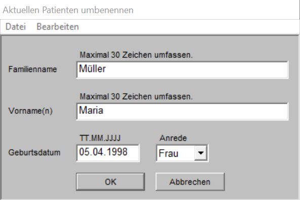 Patientenkartei -> Bearbeiten -> Patient -> Umbenennen