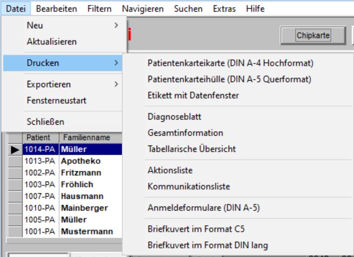 Inl der Patientenkartei sind mehrere Funktionen zum Ausdrucken implementiert worden: