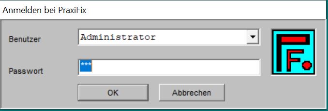 Wenn PraxiFix startet, muss man sich mit einem hinterlegten Benutzernamen und einem gültigen Passwort anmelden, sonst bleibt der Zugang verwehrt. Ein Benutzer kann sich nicht selbst anlegen. Alle Benutzer werden vom Administrator des Programms mit Passwort angelegt. Diese Benutzereinstellungen bleiben persistent gespeichert und können vom jeweiligen Benutzer nicht interaktiv abgeändert werden. Nur der Administrator kann Benutzernamen umbenennen und Passwörter verändern.