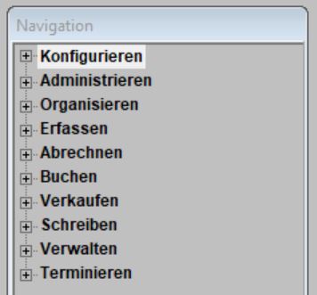Am linken Bildschirmrand befindet sich das Navigationsfenster mit dem Navigationsmenü. Die meisten Kunden arbeiten mit diesem Navigationsmenü als Hauptmenü, weil es am linken Bildschirmrand stationär zu sehen ist. Nach dem Programmstart ist es immer zugeklappt. Wenn der Bediener auf ein Pluszeichen klickt, öffnet sich die nächste Menüebene und gibt die weiteren Untermenüs zur Auswahl frei. Diese Art der Bedienung ist sehr entspannend, wenn man an einem großen Bildschirm mit guter Pixelauflösung arbeitet. Dabei ist die Aufgabenverteilung klar: im Navigationsmenü wird ein Prozess angezeigt, während im rechten Arbeitsbereich die Formulare geöffnet zur Verfügung stehen. Diese Anordnung ist ergonomisch. Sie entspricht der methodischen Vorgehensweise der meisten Anwender.
