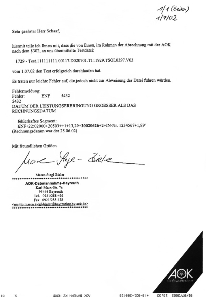 "Sehr geehrter Herr Schaaf, hiermit teile ich Ihnen mit, dass die von Ihnen im Rahmen der Abrechnung mit der AOK nach dem §302 an uns übermittelte Testdatei #1729 vom 1.07.2002 den Test erfolgreich durchlaufen hat. Es traten nur leichte Fehler auf, die jedoch nicht zur Abweisung der Datei führen würden. Datum der Leistungserbringung groesser als das Rechnungsdatum."